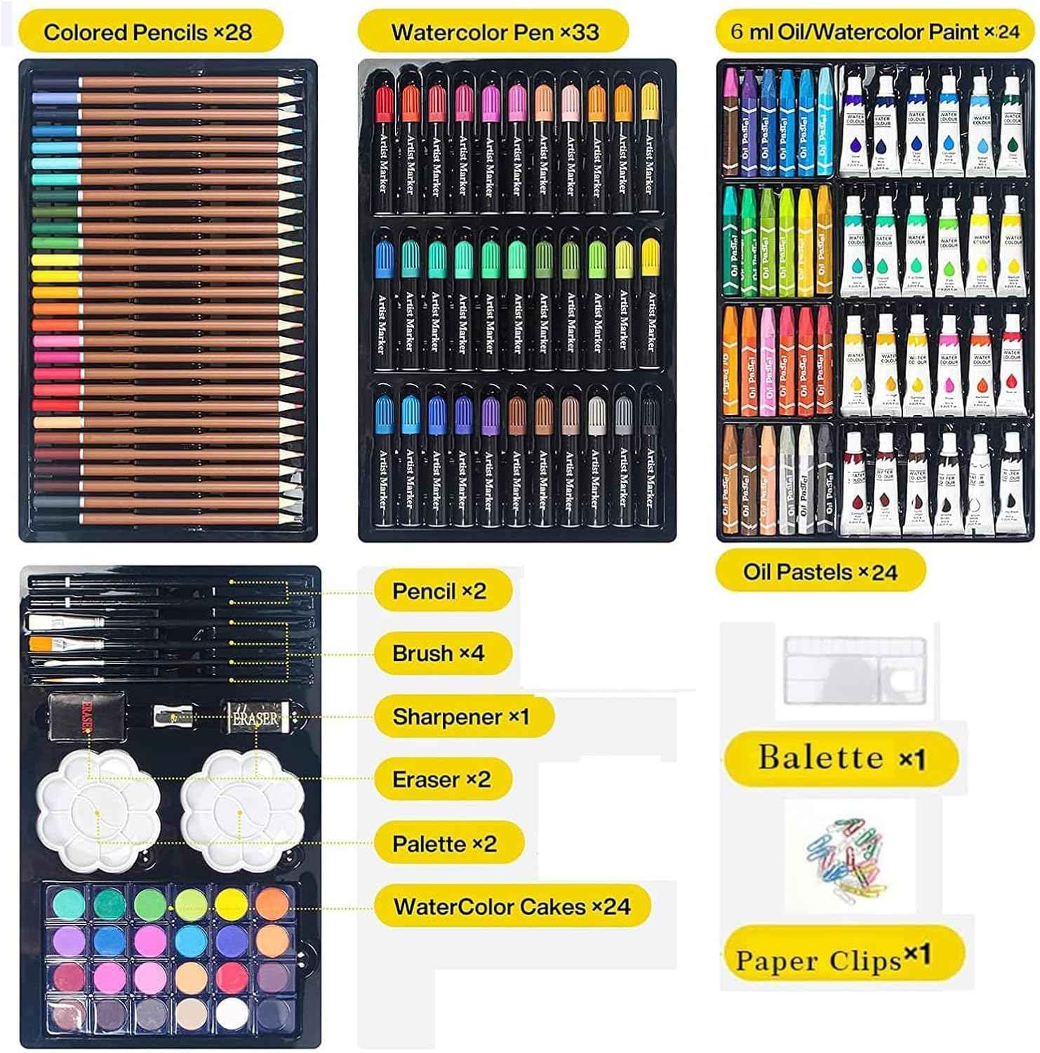Ponosno predstavljamo naš 145-delni umetniški komplet, ki vsebuje barvice, čopiče in flomastre. Ta komplet je popoln za vse ljubitelje umetnosti, ne glede na starost ali izkušnje. Z njim boste lahko izrazili svojo ustvarjalnost na načine, ki jih še niste poznali.