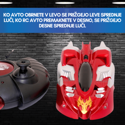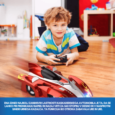 Ena izmed najbolj zanimivih lastnosti kaskaderskega avtomobila je ta, da se lahko pri premikanju naprej in nazaj vrti za 360 stopinj v desno in v nasprotni smeri urnega kazalca. Ta funkcija bo otroka zabavala ure in ure. Brezžični daljinski upravljalnik omogoča uporabniku popoln nadzor nad avtomobilom.