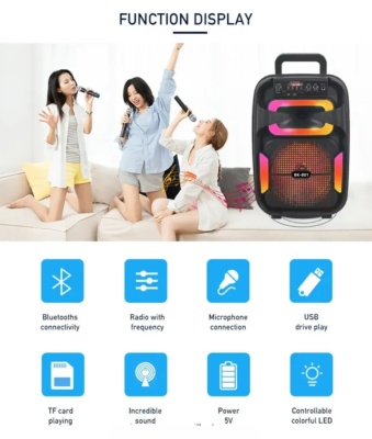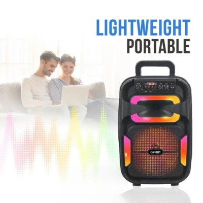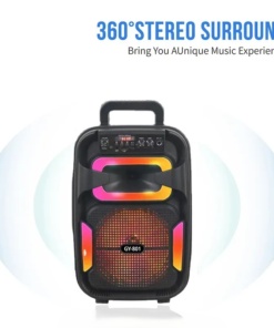 🔊GY-801 je odličen karaoke prenosni zvočnik s široko paleto možnosti za predvajanje glasbe. S povezavo prek Bluetooth 5.0, omogoča enostaven in hiter prenos avdio signala do razdalje 10 metrov. Podpira tudi A2DP za boljši zvok. Zvočnik je opremljen z vhodom za microSD kartico (do 32 GB) in USB ključ, podprti formati pa so MP3 in WMA. Poleg tega je vgrajen tudi FM radio s frekvenčnim razponom od 87,5 MHz do 108 MHz, AUX-IN vhod 3,5mm jack vhod za priklop žičnega mikrofona. Zmogljiv zvočnik velikosti 8″ zagotavlja do 10W maksimalne glasbene moči, ki jo lahko izkoristimo pri uporabi karaoke funkcije z vgrajenim žičnim mikrofonom.