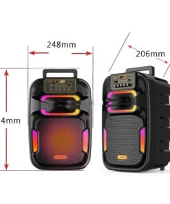 🔊Zvočnik je opremljen tudi z vgrajenimi DISCO LED LIGHT efekti, ki ustvarijo zabavno vzdušje. LED zaslon z rdečo osvetlitvijo omogoča enostavno uporabo, napajanje pa poteka preko DC 5V / 2A in vgrajene polnilne baterije 3,7V, ki omogoča do 3-6 uri neprekinjenega delovanja. Zvočnik je izdelan v atraktivnem dizajnu in ima dimenzije 374 * 248 * 206mm. GY-801 je zanesljiv karaoke zvočnik, ki omogoča brezskrbno zabavo kjerkoli in kadarkoli.