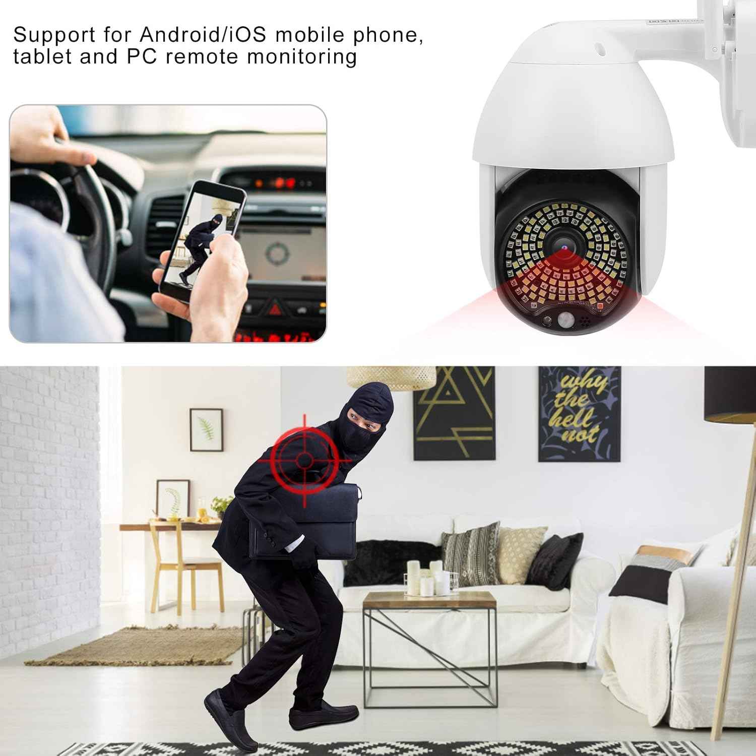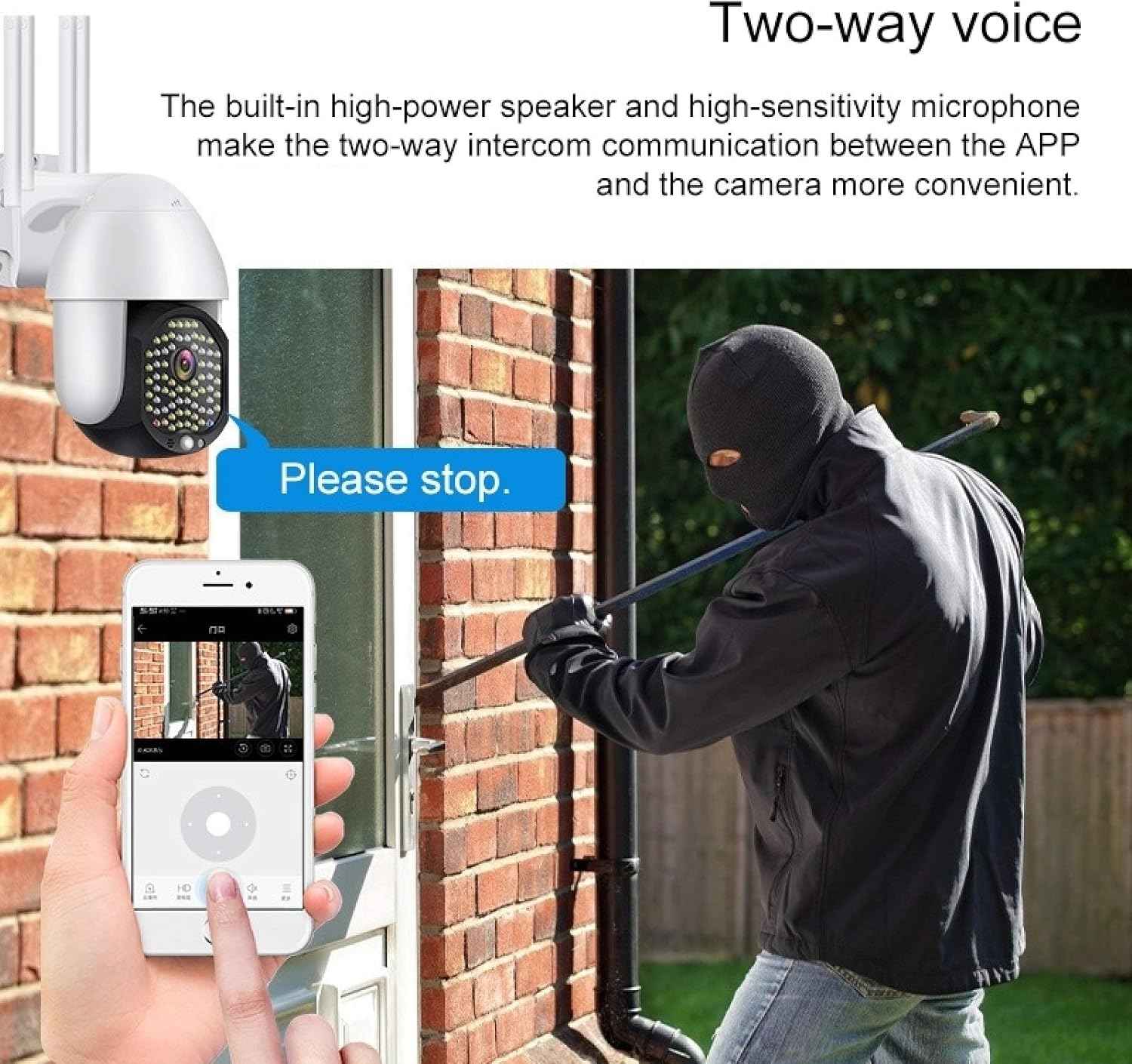 💯Dvosmerni zvok in gladek video: z oddaljenim pogledom v aplikaciji za telefon lahko spremljate svojo hišo kadar koli, ko delate; Vgrajen dvosmerni zvok na tej zunanji ptz kameri, z obiskovalcem lahko vzpostavite stik preko telefona kadarkoli in kjerkoli.