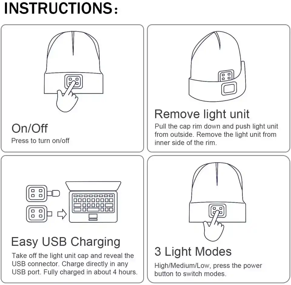 LED lučka na kapi ima vgrajeno baterijo s kapaciteto 300mAh, se polni na USB priključek ter je snemljiva, zato je kapo možno tudi enostavno oprati. Luč omogoča 3 različne nastavitve jakosti svetlobe, maksimalna svetilnost pa znaša neverjetnih 150 lumnov!