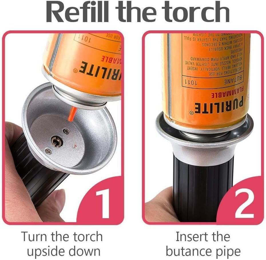 🔥Način neprekinjenega ognja, ki ga je mogoče ponovno napolniti: Ta butanski vžigalnik je mogoče ponovno napolniti, ko ga zmanjka, kar je bolj okolju prijazno. (Opomba: Prosimo, uporabite butan plin z dolgo šobo) Pritisnite gumb, da prižgete ogenj, istočasno vrtite v smeri urinega kazalca, nato pa bo ogenj ohranil, obrnite gumb v nasprotni smeri urinega kazalca, plamen ugasne.