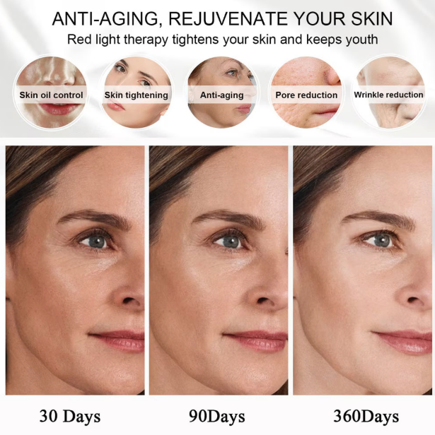 🔹1. Rdeča svetloba (630 nm): Izboljša kožo, pomlajuje, gladi gube in obnavlja v globino;