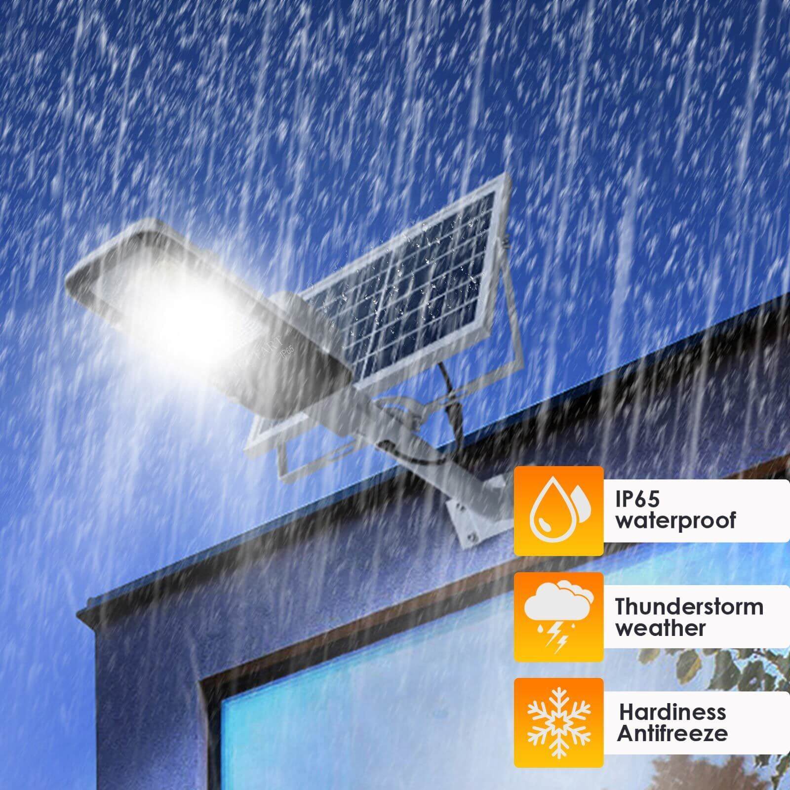 ☀️Na prostem je glavni namen solarna LED svetilka, in odporni na slabo vreme je tudi temeljna zahteva visoko-kakovostna zunanja razsvetljava.Naše sončne svetilke imajo vgrajene zaščitne naprave, da preprečite poškodbe zaradi strele vpliv.