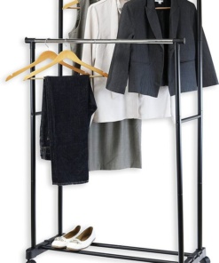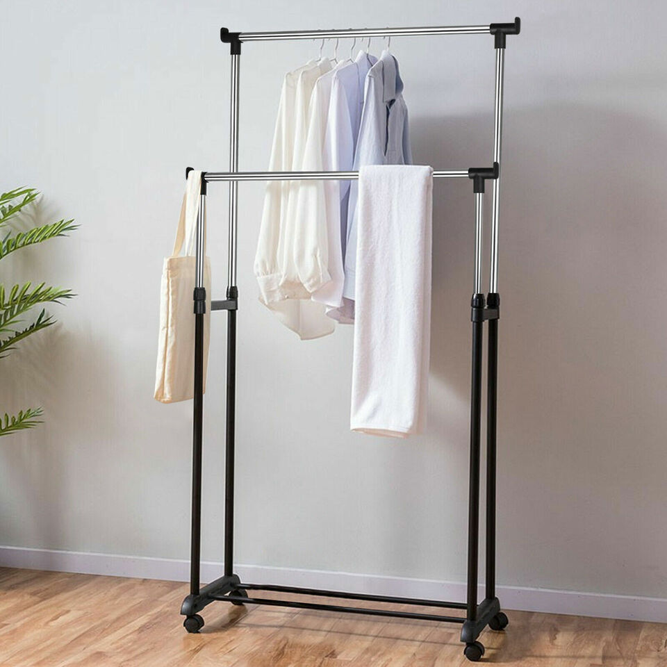 🌟S kolesi na dnu stojala je enostavno premikanje po prostoru, kar vam omogoča prilagodljivost in enostavnost pri organizaciji garderobe. Dvojni teleskopski obešalnik na kolesih je popolna rešitev na vsakem mestu, kjer potrebujete priročno stojalo za oblačila. Popoln za dom, pisarno, trgovino ali frizerski salon.
