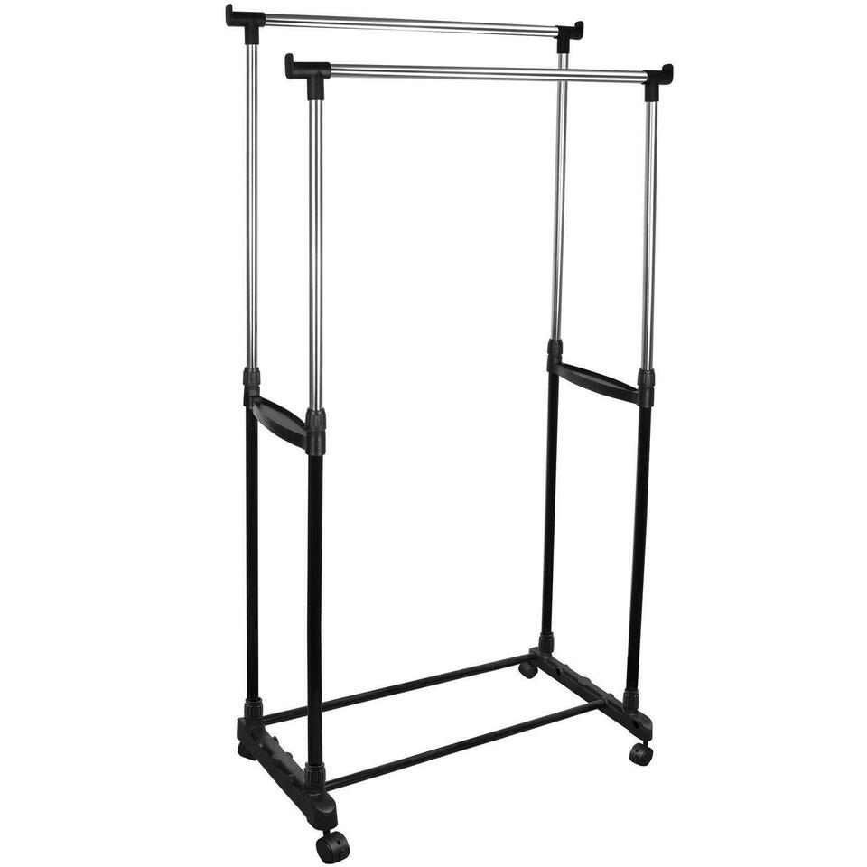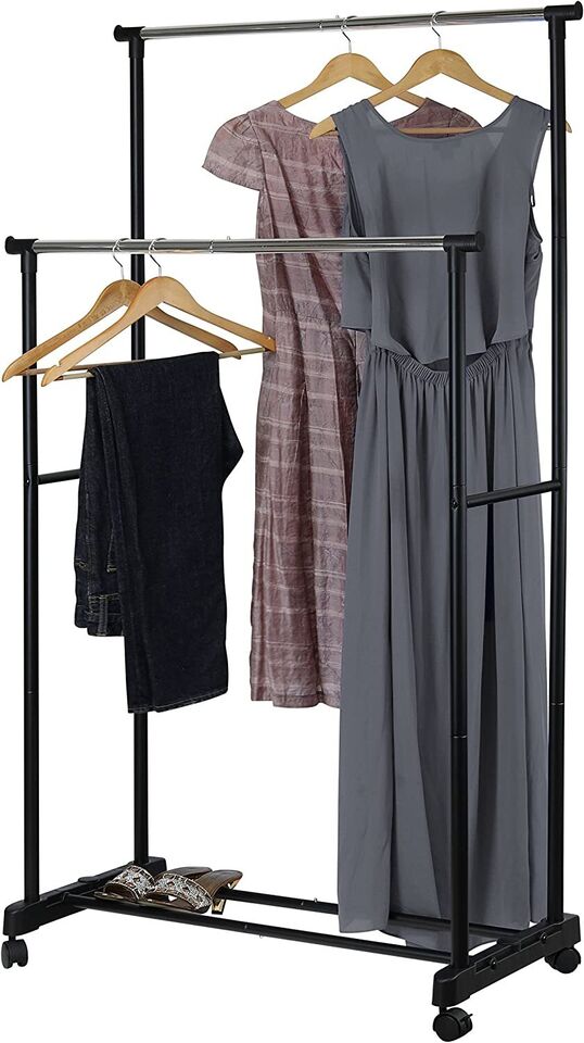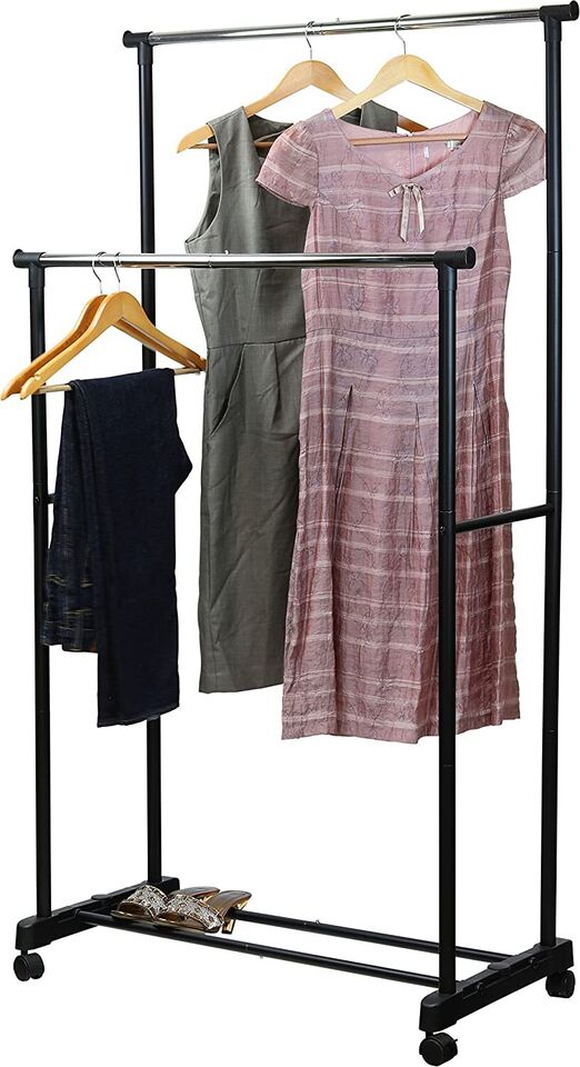 🌟Vzdržljiva, lahka aluminijasta konstrukcija Dvojni obešalnik Plastični nosilci Zaščita pred zdrsom oblačil Teleskopska nastavitev višine Polica za čevlje Kolesa z zaklepom Hitra in enostavna namestitev