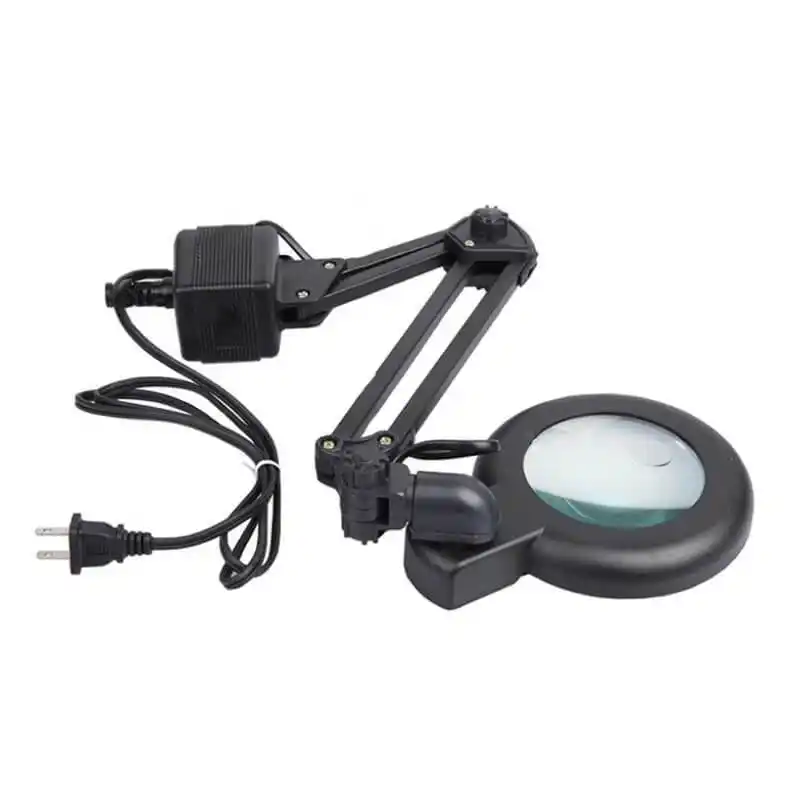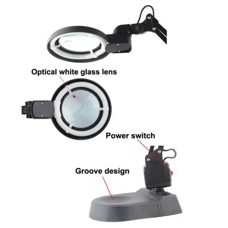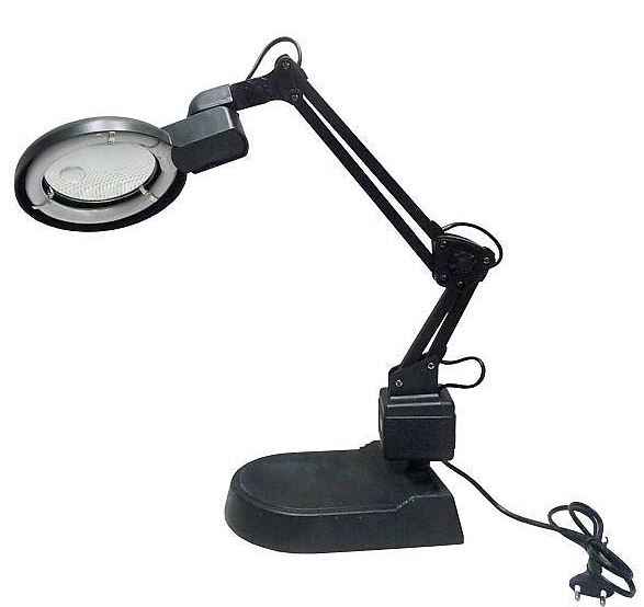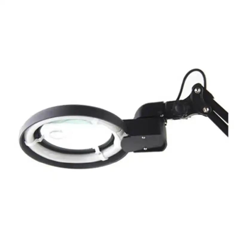 LED svetilka s povečevalnim steklom, pritrjena na mizo. Opremljen je z zložljivo, nastavljivo roko, ki omogoča nastavitev pod poljubnim kotom. Veliko povečevalno steklo je kot nalašč za kozmetične aplikacije. Uporaba krožnega LED panela zagotavlja močan in dobro razpršen žarek svetlobe, tako da se lahko pravilno osredotočite na svoje delo. Svetilka ima belo barvno nastavitev.