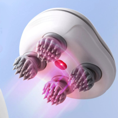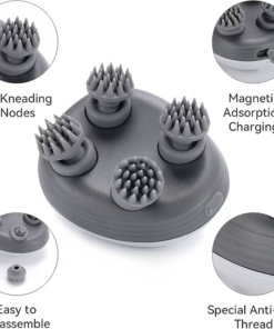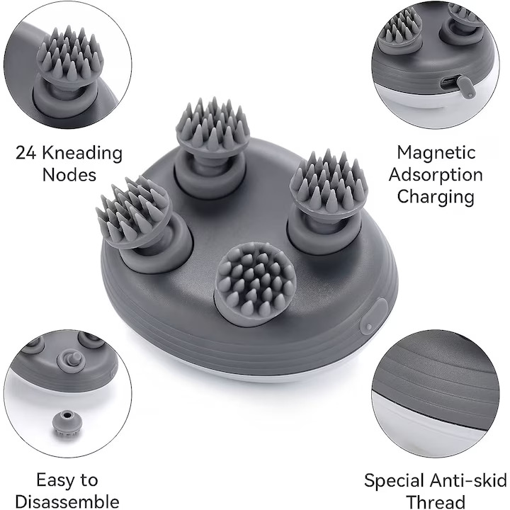 Masažer za lasišče zagotavlja nežno masažo živčnih točk. S svojim inovativnim dizajnom in posebej razvitimi masažnimi glavami lahko ta masažni aparat natančno stimulira živčne točke na vašem lasišču. To lahko pomaga razbremeniti napetost in vam nudi pomirjujočo in sproščujočo izkušnjo .