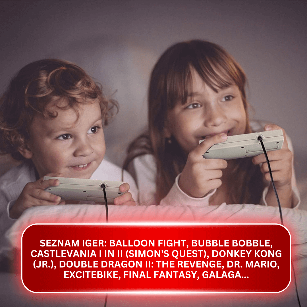 💗Seznam iger: Balloon Fight, Bubble Bobble, Castlevania I in II (Simon’s Quest), Donkey Kong (Jr.), Double Dragon II: The Revenge, Dr. Mario, Excitebike, Final Fantasy, Galaga, Ghosts’n Goblins, Gradius, Ice Climber, Kid Icarus, Kirby’s Adventure, Mario Bros, Mega Man 2, Metroid, Ninja Gaiden, Pac-man, Pun-Out!!!, StarTropics, Super C, Super Mario Bros (1, 2, 3), Tecmo Bowl, The Legend of Zelda in Zelda II…