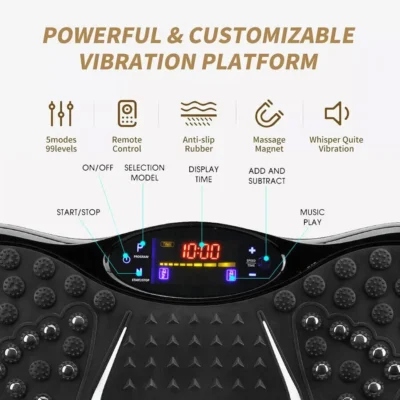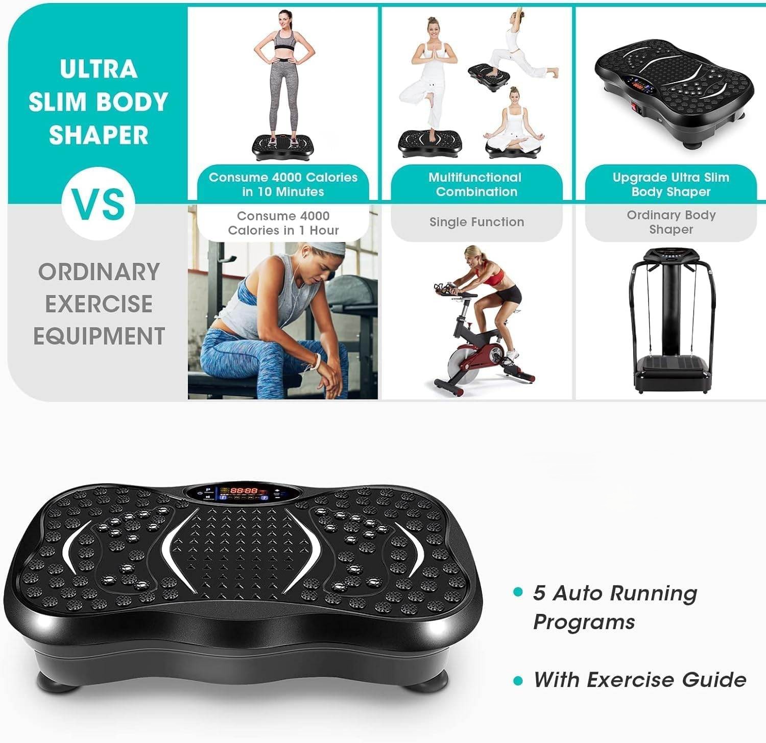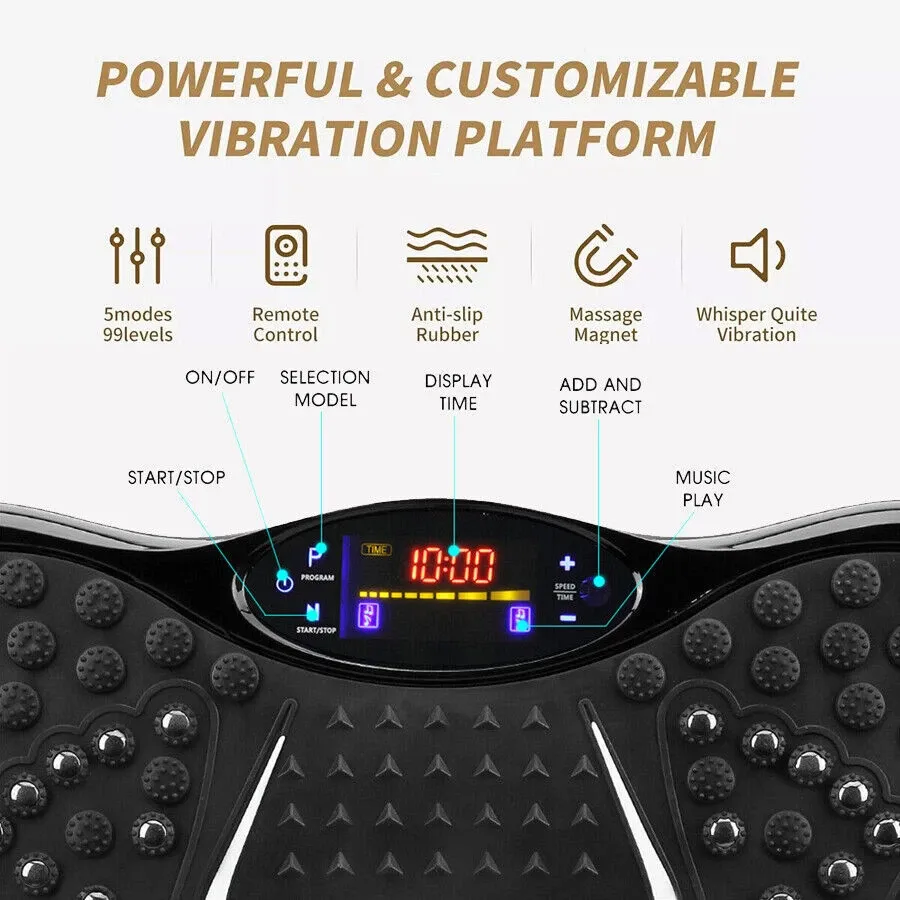❤️Edinstvena vibracijska plošča je zaradi svoje površine varna in lahko vadite brez težav. Osvetljen zaslon na platformi vam omogoča, da preverite svojo vadbo in vse to med poslušanjem vaše najljubše glasbe neposredno prek posebne funkcije v vibrirajoči platformi.